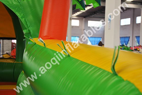 At the front, there are 3 models with animal printing putting on the small pool. You can hang water guns/tubes on the models with Velcro straps and spray water to the pool. The middle part is combining by climbing and sliding with a little slope. So it is suitable for little kids to play on it safety. As you can see, there also have Velcro straps at the side wall of the slide. These Velcro straps are to tie down and fix the water hose, so that the water hose can climb up to the top of the back house and then the water can come out and spray directly down the slide lane by using a water pump that connects to the other end of the water hose on the ground. At the top of the house, a cute 3D monkey is sitting on. In the house, you can put plastic balls or bounce there. With net windows around are available for kids to see outside or their parents to watch their kids to play inside safety.