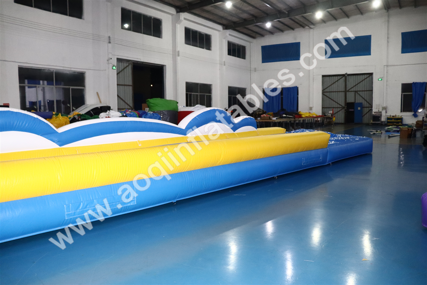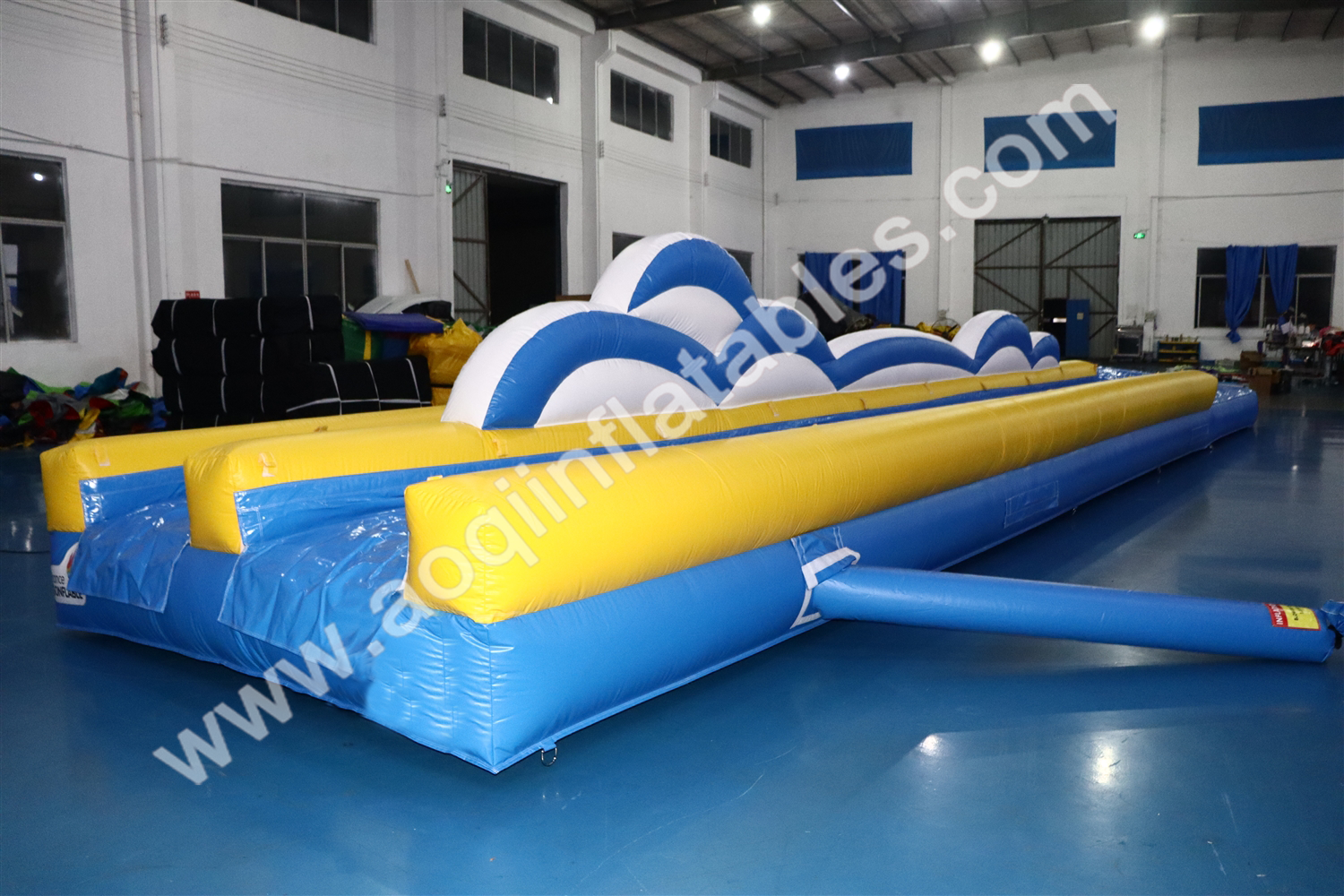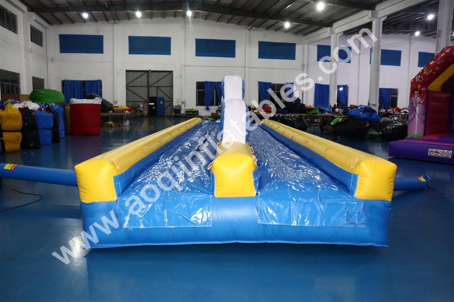 Extra long blue inflatable slide