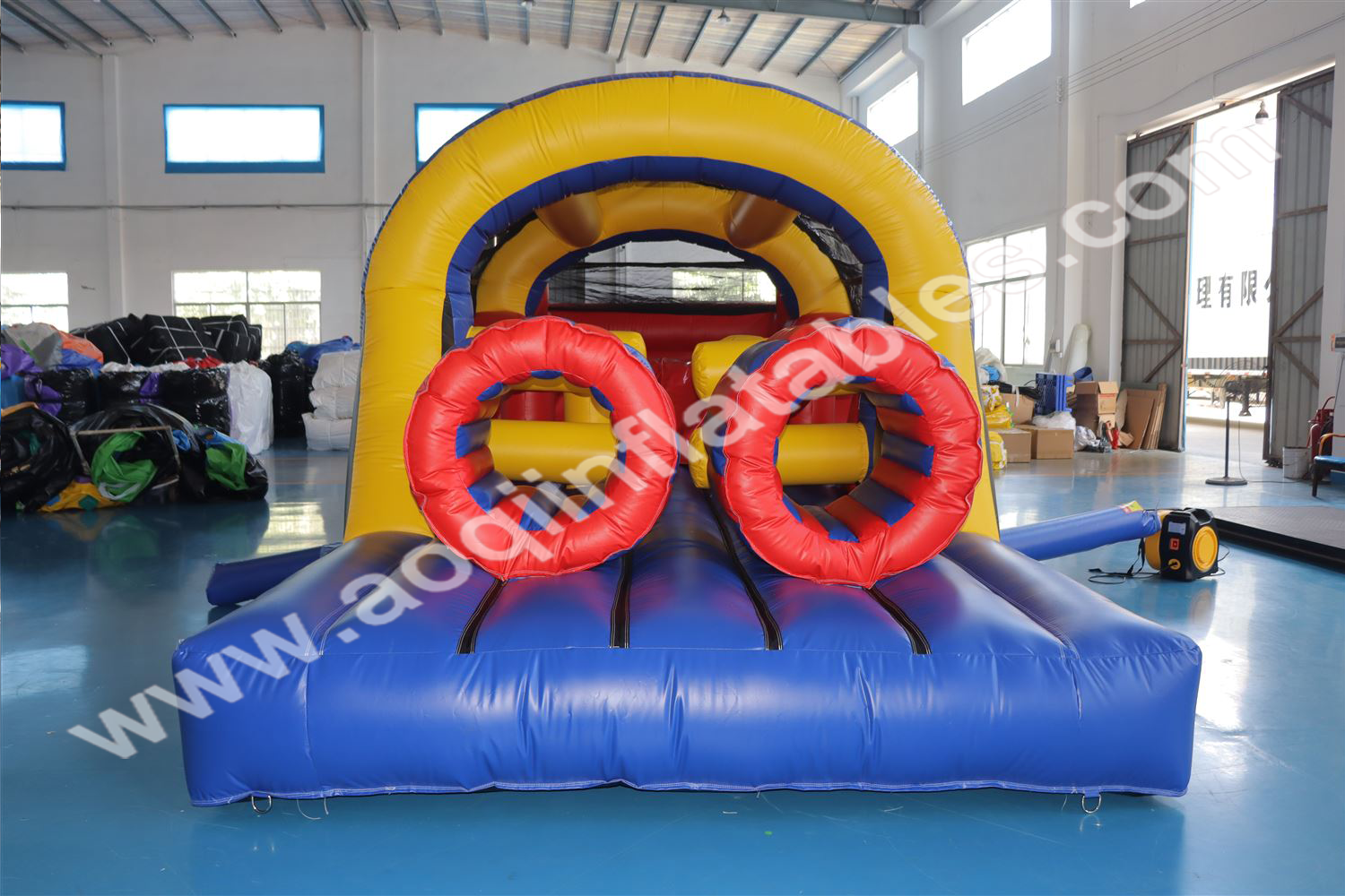 Blue and yellow inflatable obstacle course